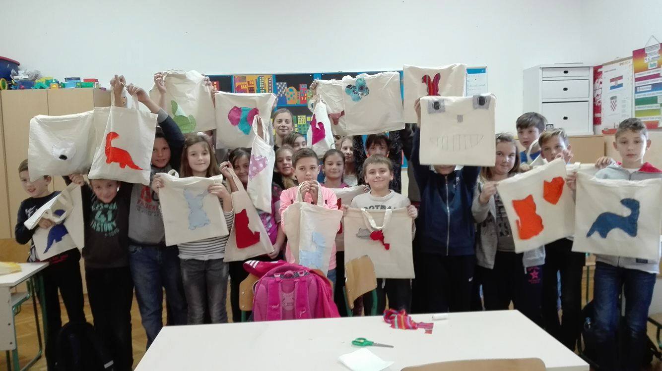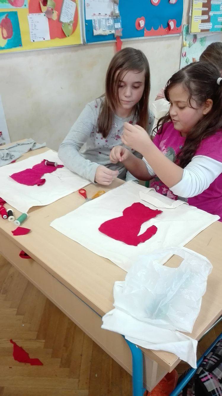 U 4.c nedavno je održana radionica pod nazivom „Ukrasi svoju platnenu vrećicu“. Učenici su slušali kratko predavanje o štetnosti upotrebe plastičnih vrećica. Poslije predavanja svaki učenik je dobio platnenu vrećicu (zahvaljujemo Gradu koji nam je donirao vrećice) koju je mogao ukrasiti po želji. Od starih majica koje više ne nose učenici su izrezivali različite aplikacije kojima su ukrašavali vrećice. Bilo je zabavno jer su mnogi po prvi put primili u ruke iglu i konac! Javljale su se i ideje kome i kojom prigodom će pokloniti vrećice. Radionicu su pripremile i vodile Dubravka Kečkeš i Ivana Ričko Borović.